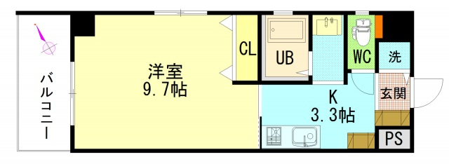 洋室 9.7帖/K 3.3帖 - 向き